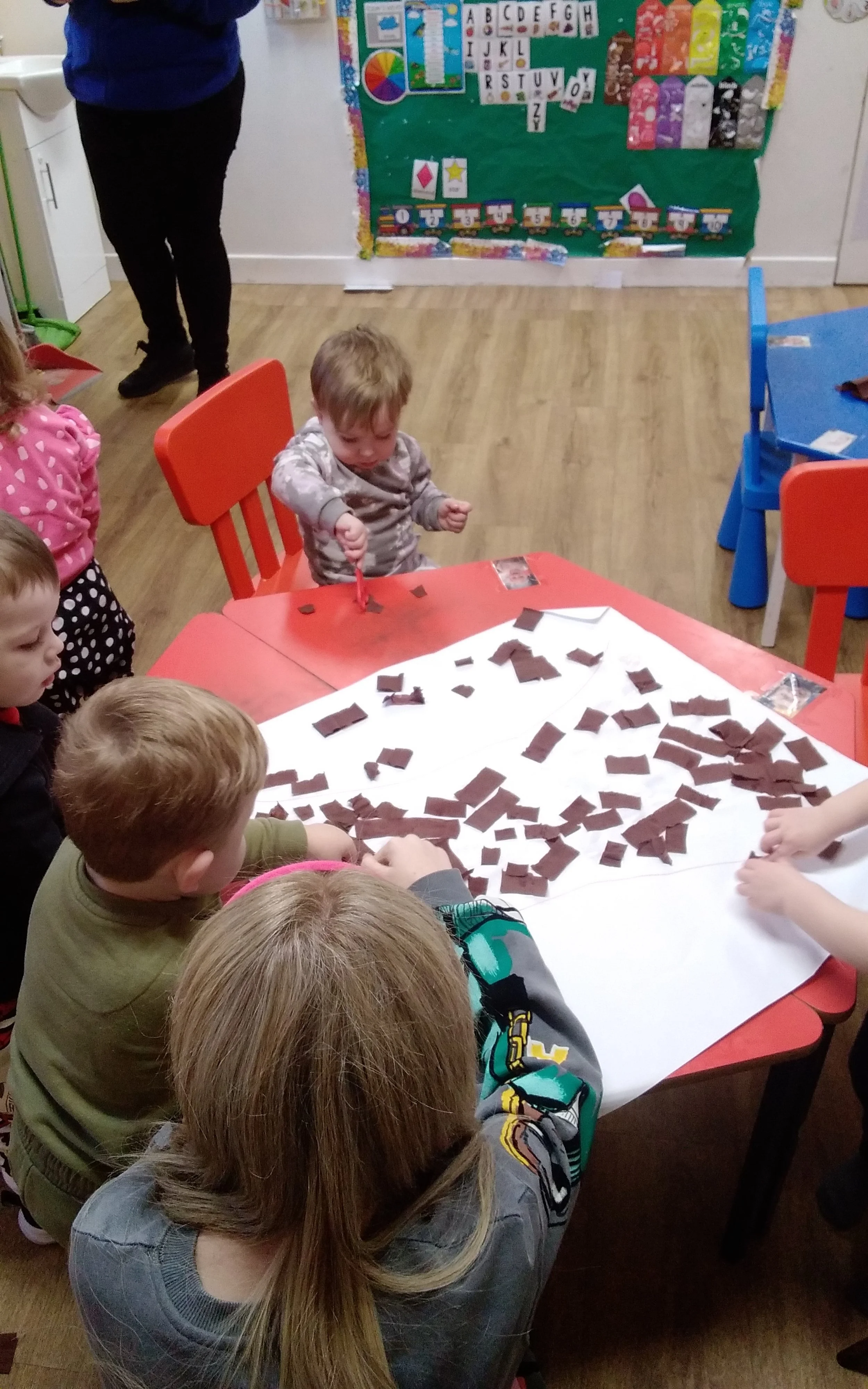 Our toddlers promoting their fine motor skills by painting and washing dolls , using kitchen supplies to pour and serve our “paella” . they use items such s jelly , glupe , oats , pasta , leaves etc to give them time to explore textures and promote sensory play.